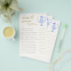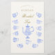An elegant bridal tea / shower "bride and groom trivia" game sheet featuring a sweet China tea set in periwinkle blue and layered with white lace (this is a digital effect), with elegant calligraphy in a shade of gold (this is also a digital effect).