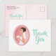 A bridal shower thank you postcard with an illustration of a smiling bride holding a bouquet of flowers in her fancy white wedding dress and wearing a veil. Set inside a pink oval frame with a scalloped border.