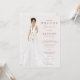 Bridal shower invitation features gorgeous bride in lace wedding gown. Multiple options available for bride’s hair colour and skin tone to most represent the bride to be. Simulated lace on back of invitation.