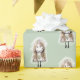 Cute stick figure bride with veil, blonde hair, lace dress, and high heels on a sage green background.