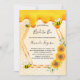 Elegant, fun, rustic summer bridal shower invitation. A yellow background with a honeycomb pattern. With a faux gold geometric frame and sweet honey dripping. Decorated with yellow and orange sunflowers and happy bumble bees. With the text: Bride to Bee and the name of the bride on front written with a modern hand lettered style script. Black letters.
