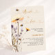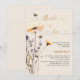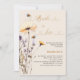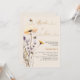 A beige coloured background. Decorated with bees and painted wildflowers in violet and pink. Personalize and add a name and party details. Gender neutral.