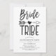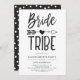 A Bachelorette party invitation tailored specifically to your bride tribe. It features a classic black and white themed look with the words bride tribe written in handwritten style font. Between both words is a tribal arrow piercing a heart.