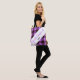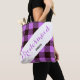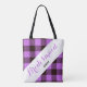 Modern, elegant and trendy customizable tote bag features "bridesmaid", "personalized name" beneath on a white stripe and Orchid / black plaid tartan background.