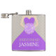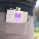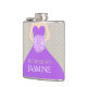 Elegant graphic bridesmaid in a rich purple dress in holding a posy of purple lilac stylized roses wedding hip flask. Reads Bridesmaid Jasmine. Personalize with your own name and title. A great gift idea for bridal showers, hen nights or wedding rehearsals.