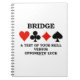 Wry bridge humour is alive and well on any of these gifts featuring the four card suits along with the following bridge saying: "Bridge A Test Of Your Skill Versus Opponents' Luck". No need to be an experienced bridge player to enjoy tongue-in-cheek bridge attitude today with these memorable bridge saying gifts!