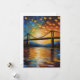 A vibrant sunset casts a warm glow over a serene river, crossed by a silhouetted bridge with trees lining both shores. The sky is dotted with colourful, mosaic-like patches, creating a lively and dynamic backdrop.
