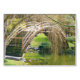 A bridge with tree branches hanging over it and lake under the bridge.