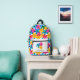 Add a bright touch to your day with this patterned backpack. It has a retro style with overlapping hippie daisy flowers in bright yellow, blue and magenta pink. The hand drawn graphics are designed to imitate classic risograph style printing.retro style with hippie daisy flowers in bright yellow, blue and magenta pink. The front pocket is ready to be personalized with a name, initials or other custom text.
