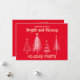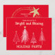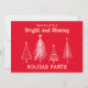 A festive Bright and Shining Christmas Holiday Party Invitation Card with gold colored text and elegant white Christmas Trees on a bold red background. The front text includes: Please Join Us For A Bright and Shining Holiday Party. The reverse text includes: The Date, Time, Location, Host and RSVP Info. To personalize, simply insert your details into our easy template, replacing the sample text. Colors may be changed using our easy Color Picker Tool.