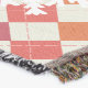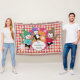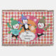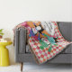 Beautiful Christmas holiday throw blanket features three adorable penguins in ice skates, sweaters, striped scarves, and winter hats on a background of white, red, orange, and pink argyle, a solid pink area with white snowflakes, and a deep orange with white polka dots centre. You can easily personalize with your family name!