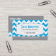 A bright blue and white chevron pattern is dominant on this card that features a bulging frame to hold business information. A grey panel on the bottom contains a website url or any other information. Further contact and business information prints on the back against a grey background accented by a chevron strip. A versatile card for consultants, creative businesses, home-based businesses plus many more. Available in alternate colours with matching products.