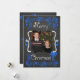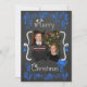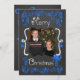 A chalkboard look background with beautiful scrolls and stars of bright blue and white text that reads "Merry Christmas" on front and "May all your days be merry & bright" on back. This beautiful customized holiday Christmas photo card has several star ornaments, and a bird in a nest design and areas you can easily add your names, the current year, and photo!