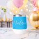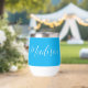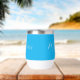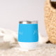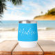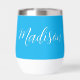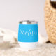 A bright blue personalized monogram wine tumbler for a girl or guy who loves trendy, handwritten gifts. Beautiful cursive script spelling out your name in modern typography.