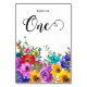 Bright and bold floral table numbers that can easily be customized. Design features calligraphy script lettering, hand painted watercolor flowers in vibrant hues of red, purple, blue, pink and yellow with green foliage.