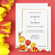 Elegant bright and colourful watercolor wedding invitation. The design features hand-drawn watercolor tulips in shades of red and yellow with green botanical elements. The colours of the flowers are vibrant and saturated. A stylish and elegant golden frame with text in elegant calligraphy completes the design. Personalize the details by adding your name, location, date, etc. Please browse my Red and Yellow Spring Tulip Wedding Collection for more matching wedding items.