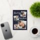 Our beautiful rustic chic holiday photo card features four of your favourite square family photos in a collage layout. "Merry Christmas" appears white hand lettered calligraphy script typography on a rich navy blue background accented with green watercolor leaves, gold foil poinsettia flowers, and gold foil holly berries. Customize with your family name or personal message.