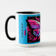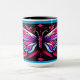 "Bright Butterfly" Customizable Coffee/Tea Mug. Add a pop of colour and whimsy to your living space with our blue and pink butterfly pillow featuring a vibrant tattoo-style butterfly design in hot pink, lavender, and black on a turquoise background, making it a versatile and eye-catching addition to your home decor.