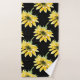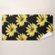 Watercolor Sunflower Bath Towel Yellow Striped Hand Towel. Solid Black Wash Cloth. Cheerful and Colourful. Black background.