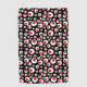 This golf towel is is black with an abstract bright circular pattern of red circles in bigger white circles.