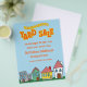 NOTE: The blue background behind this design can be removed entirely or changed to another colour. Wording is in bright orange and yellow, the bottom is decorated with cartoon style houses to represent a subdivision. Multiple sizes are available.