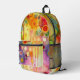 An explosion of bright bold colours make this artistic backpack stand out with modern flair. Bright colours of yellow, orange, red, green, blue and purple are blended in round shapes and dripping paint splatters with stylish results. A text template is included on the left side of the backpack to personalize with your monogram initials. Whether an art student, art lover or one who loves bright bold colours, this backpack is a fun choice to carry what you need wherever you go!