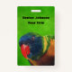 This name or identification badge has the head and face of a bright colourful macaw Parrot whose feathers are blue, green, yellow and orange on a green backgroun. Back is same green background. Customize your name and information with the templates.