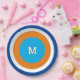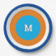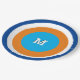 A monogrammed paper plate, with a bold geometric design of concentric circles in dark blue, white, orange and medium blue. Personalize with an initial, to appear in the centre of the design. A fun and bright addition to any party.