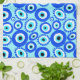 Colourful kitchen towel printed with a pattern of Greek evil eyes. Ancient Greeks believed the bearer or wearer of this symbol would be protected from the evil gaze of others. Nowadays, the eye is seen as a lucky symbol or talisman.