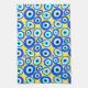 Colourful kitchen towel printed with a pattern of Greek evil eyes. Ancient Greeks believed the bearer or wearer of this symbol would be protected from the evil gaze of others. Nowadays, the eye is seen as a lucky symbol or talisman.