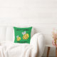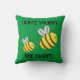Don't worry. Bee happy. This pun is written in a distressed style capitals on a bright green square throw pillow, and decorated with two cartoon style, very cute, baby bees. The bees are mainly bright yellow and the text is black. The design is on both sides of the pillow / cushion.