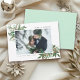 These custom seasonal greetings are joyful bright designs featuring your favourite photo surrounded by evergreen misteltoe sprigs and cotton watercolors as well as elegant typography showing your personal, easy to customize message - here it is reading: Merry & Married. This version shows a delicate cheerful pastel light green dot pattern on the back.