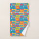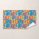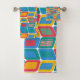 This towel set has a mid-century modern design of bright colours that make rounded rectangles with other rectangles inside formed by a collection of lines.