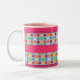 A mug featuring a design of bright little dots against a grey background across top and bottom. Hot pink strip for name between design. Available in a variety of colours and styles including ringer, travel, and morphing.