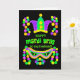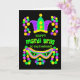 A vibrantly coloured Mardi Gras Greeting Card for a Husband, with a crown, a mask and a string of beads in bright green, purple and yellow on a black background. You can change the inside message if you wish.