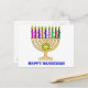 A bright Hannukah menorah with the words Happy Hannukah welcomes the holiday. Happy latke eating!