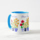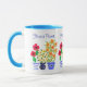 A pretty white mug with a powder blue lip and handle decorated on all sideswith a floral design from a handpainted paper collage by Judy Adamson and the words, 'Flower Power' , which you can change or delete if you wish.