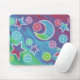 A brightly coloured night sky with shining stars and striped moon. Mouse pad with a purple, pink, blue and green customizable design for you to personalise with your own text, images and ideas. An original coloured pencil drawing by Jess Perry.