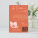 A modern wedding detail card in trendy bright orange and grapefruit red. This shade of orange is called Verona Sunset. Details in faux gold, a silhuette of a delicate flower. Modern typography and on the back add your own photo in arched shape. Make sure to add your QR code website.