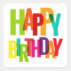 A bright and modern “HAPPY BIRTHDAY” square sticker with bold overlapping rainbow letters — perfect for gift bags, party favors, envelopes, and adding a cheerful pop of color to any celebration.