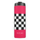 A black and white classic chequerboard pattern, with some bright vibrant pink.