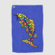 This golf towel is a deep vibrant blue with tiny white flecks and a bright pop art style fantasy fish with colourful scales in blue, orange, yellow, red and green.