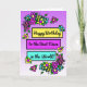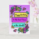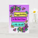 Carte d'anniversaire Joyeuse pour votre nièce, dessinée à la main, de style folklorique aux couleurs vives, fleur et papillon violet, jaune et turquoise.
