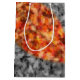 A selectively coloured autumn photograph of fallen crepe myrtle leaves, with a gold-framed leaf shape of bright red, orange, and yellow against a black and white background.