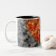 A selectively coloured autumn photograph of fallen crepe myrtle leaves, with a gold-framed leaf shape of bright red, orange, and yellow against a black and white background.