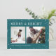 A modern and festive design for your holiday greetings featuring two photos aligned side by side, on a teal spruce background dotted with stars. "Merry and Bright" appears across the top in classic serif lettering, with "Warm Wishes," your family name, and the year along the bottom. A cheerful and colourful design for Christmas 2021.