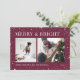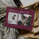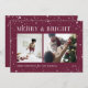 A modern and festive design for your holiday greetings featuring two photos aligned side by side, on a rich plum background dotted with stars. "Merry and Bright" appears across the top in classic serif lettering, with "Merry Christmas," your family name, and the year along the bottom. A cheerful and colourful design for Christmas 2021.