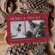 A modern and festive design for your holiday greetings featuring two photos aligned side by side, on a red background dotted with stars. "Merry and Bright" appears across the top in classic serif lettering, with "Happy Holidays," your family name, and the year along the bottom. A cheerful and colourful design for Christmas 2021.