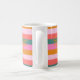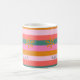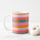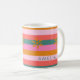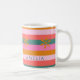 Cozy Christmas Bright Stripe and snowflake custom name coffee mug. Perfect holiday gift for tea, coffee or hot chocolate on cold winter nights. Get ready to celebrate the season in style with this fun and cheerful striped mug with unexpected Christmas colours—pink, teal green, golden yellow, and coral. A modern, colourful stripe pattern adds extra flair. Makes a perfect Christmas gift.
