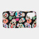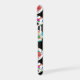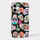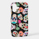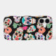 Bright and colorful images of sugar skulls make a fun pattern on this unique phone case. There are several different skull images, all individual in various colors, and placed on a dramatic black background.